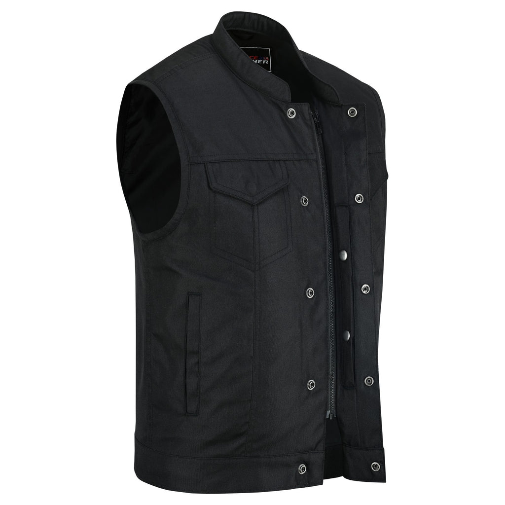 Upgrade your riding gear with this Men’s Heavy-Duty Textile Club Vest, engineered for riders who want durability, storage, and clean club-style aesthetics. Made from abrasion-resistant textile, it offers a strong yet comfortable feel for long days on the road. The snap-down front flap sits over a full-length zipper to deliver added wind protection and a secure fit. Functional storage includes two chest patch pockets, two side hand pockets, and two CCW pockets with internal holster straps for secure gear placement. The vest’s straight-cut design makes it easy to layer over shirts, flannels, or hoodies, ensuring comfort in any season. Whether you’re riding daily or gearing up for weekend trips, this vest provides the strength and practicality every rider needs.