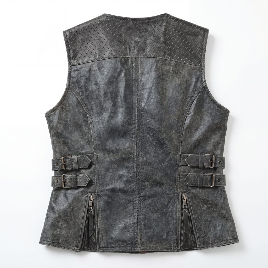 Experience the difference of wearing a vest made from our Soft Premium Leather. Our High Mileage vest's unique distressed gray leather offers a stylishly rugged appeal that complements any outfit, while providing exceptional durability for even the longest journeys.