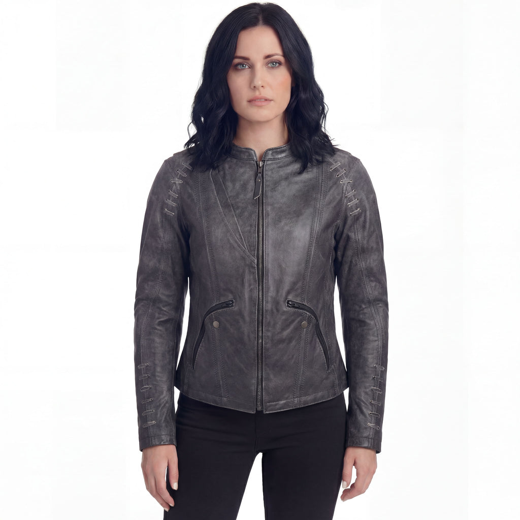 High Mileage Women's Lace and Grommet Detail Distressed Gray Goat Skin Leather Lady Biker Motorcycle Fashion Jacket.