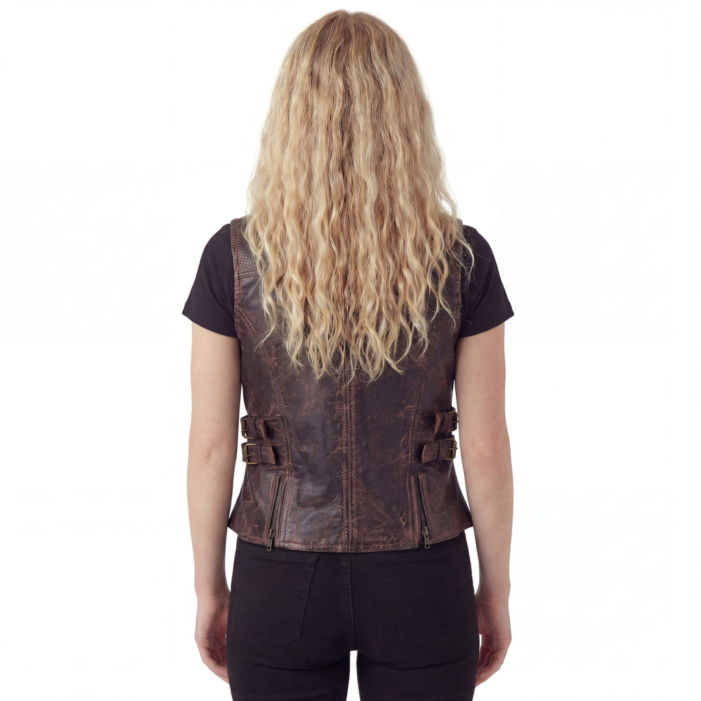 High Mileage Womens Vintage Brown Premium Cowhide Biker Motorcycle Leather Vest With Buckles.