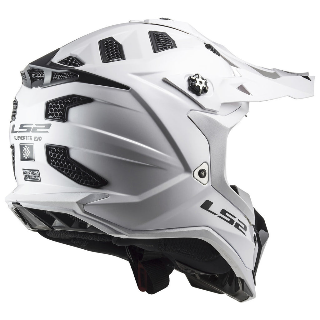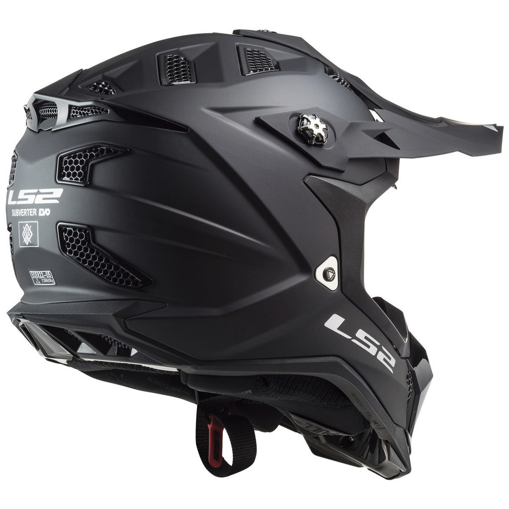 The new Subverter EVO utilizes Kinetic Polymer Alloy (KPA) offering energy managing flexibility and penetration resistance equal to high end fiber products for the shell. We have added a high performance multi density EPS for state of the art impact management. 35 separate air intake ports allow for the absolute maximum ventilation of any MX helmet on the market today. A wide eye port accommodates virtually any popular goggle. The fully removable and washable high end comfort padding keeps the rider fresh and comfortable whether racing or spending a day on the trails. LS2 uses a Double D-ring chin strap for ultimate security. The LS2 Helmets MX Subverter EVO makes high end technology available at an extraordinary value.