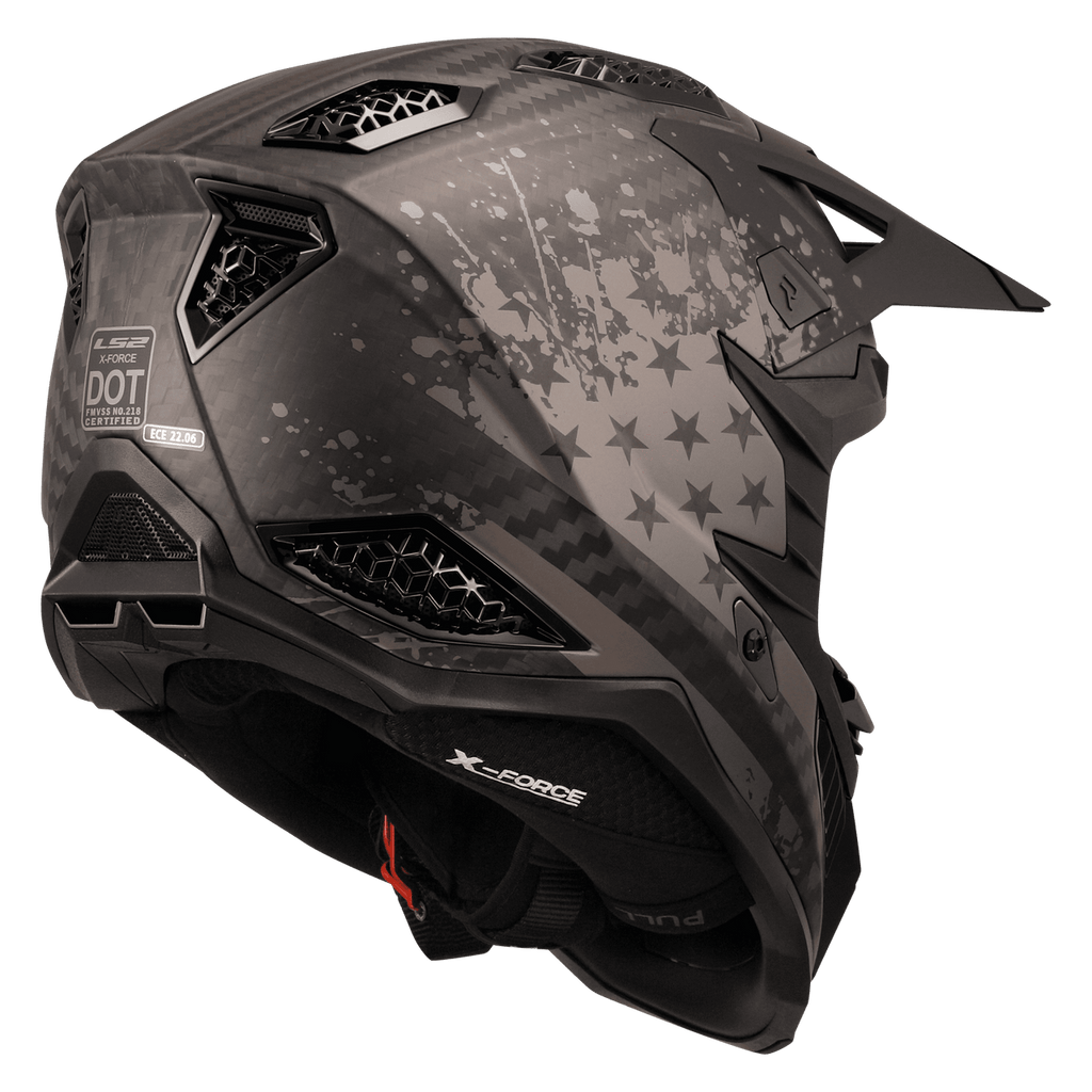 The next evolution in motocross and off-road performance helmets, the LS2 X-Force was developed to redefine how the industry reduces rotational impact and utilizes new and existing technology. LS2's X-Force utilizes a strong, lightweight 9k carbon fiber, offering robust, unrivaled durability, allowing the helmet to distribute the force of an impact across the shell surface. LS2 has also added a high performance multi density EPS for state of the art impact management. The 3D laser cut, technical fabric comfort padding is fully removable and washable and keeps the rider fresh and comfortable whether racing or spending a day on the trails. The 9k carbon fiber shell, multi-density EPS, and the high performance, technical fabric liner, combine to create A.R.E.M., which stands for Advanced Rotational Energy Management. LS2's technological advancements have once again proven that with A.R.E.M., there is no need to add a third party, rotational impact slip plane, to achieve the same, if not better results. The tests have proven that utilizing a combination of shell, EPS, and liner materials and design, A.R.E.M. is the way of the future. The LS2 Helmets X-Force makes high end, advanced technology look good and feel good, but will protect you when it counts.