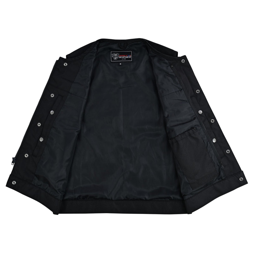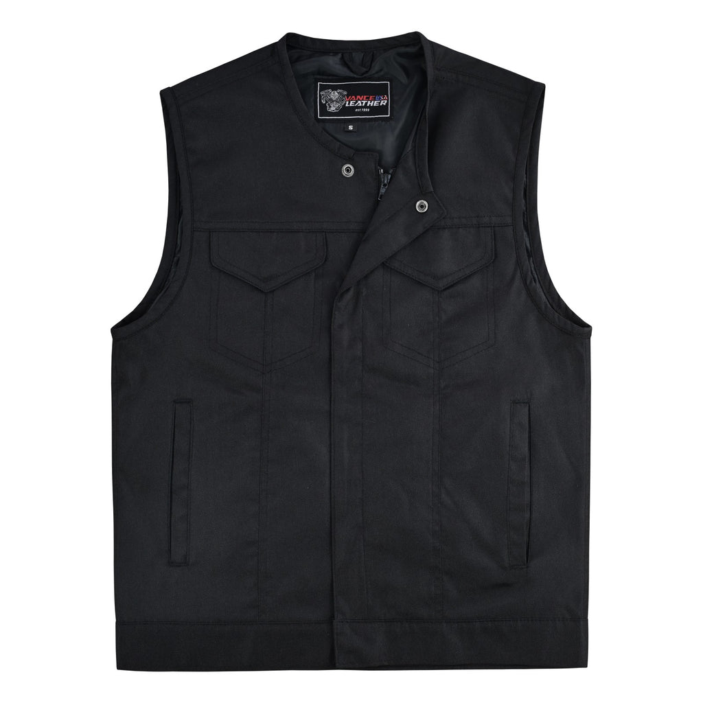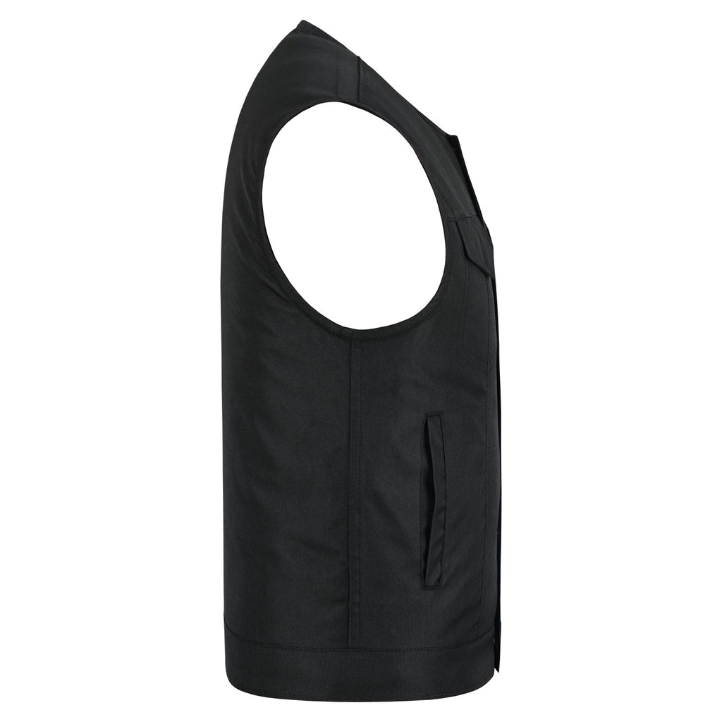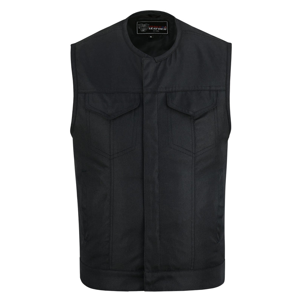 Ride in comfort and style with our Men’s Heavy-Duty Collarless Textile Motorcycle Club Vest. Constructed from tough, abrasion-resistant textile, this vest delivers durability and lightweight wear - ideal for everyday riding or club runs. The secure front closure combines snaps and a full-length zipper for a snug fit that keeps wind out and places no restriction around the neck.