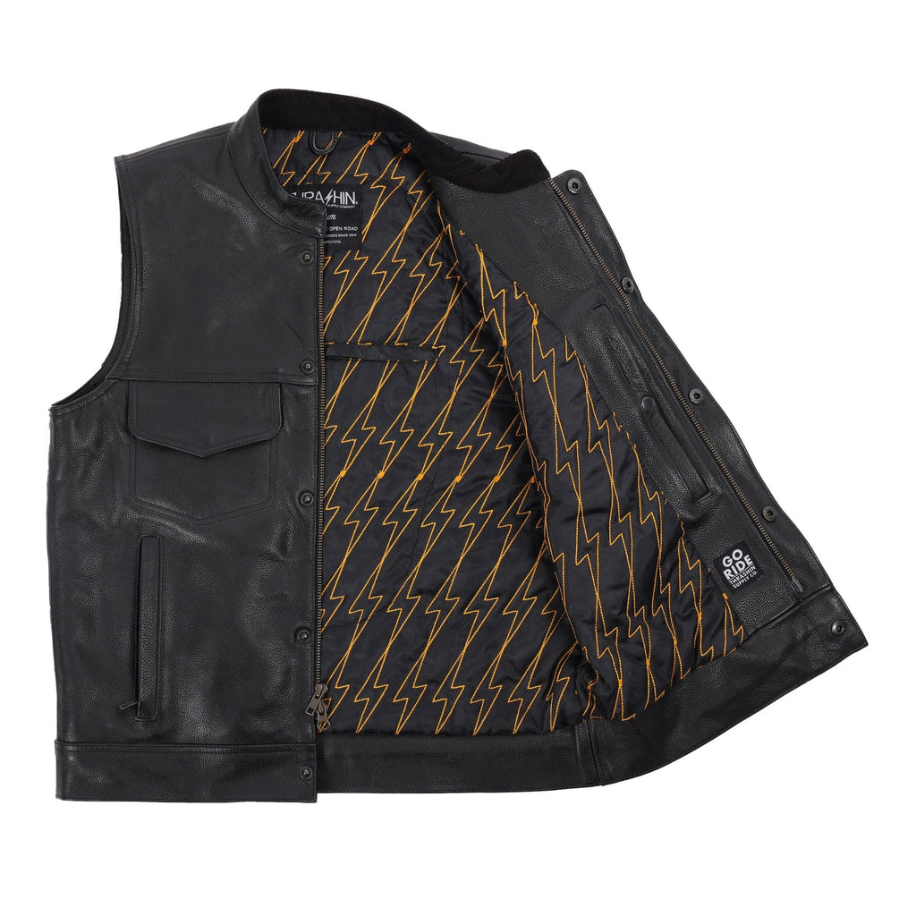 The Mulholland Vest is great for your everyday rider or the weekend warrior. The complete leather design keeps a wear-resistant combination of materials that are made for a variety of weather on the open road. The Mulholland riding vest features an interior hidden pocket for a back protector (sold separately), two front zip-up pockets, two snap-closure breast pockets and two hidden interior pockets for your valuables.