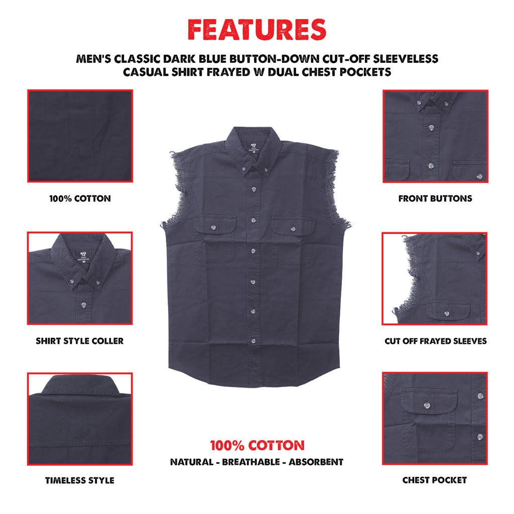 Crafted with 100% cotton and designed to keep you cool and comfortable, this versatile shirt effortlessly transitions from a hard day's work to a night out on the town. With its sleek lines and professional collar, you'll exude confidence and sophistication while embracing your inner biker. Don't compromise on comfort or style; make a statement with our Biker Cut-Off Sleeveless Shirt today!
