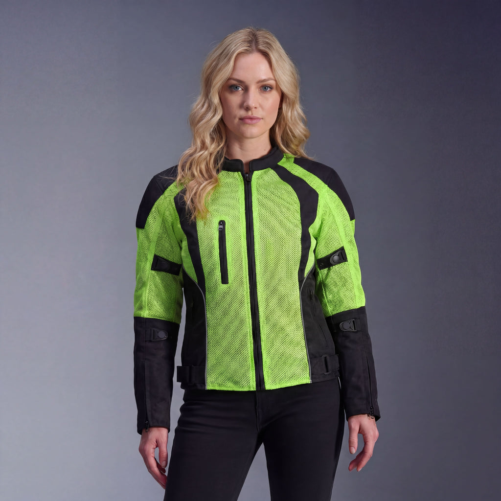 Vance Womens High Visibility Mesh Motorcycle Riding Jacket With CE Armor & Removeable Thermal Liner.